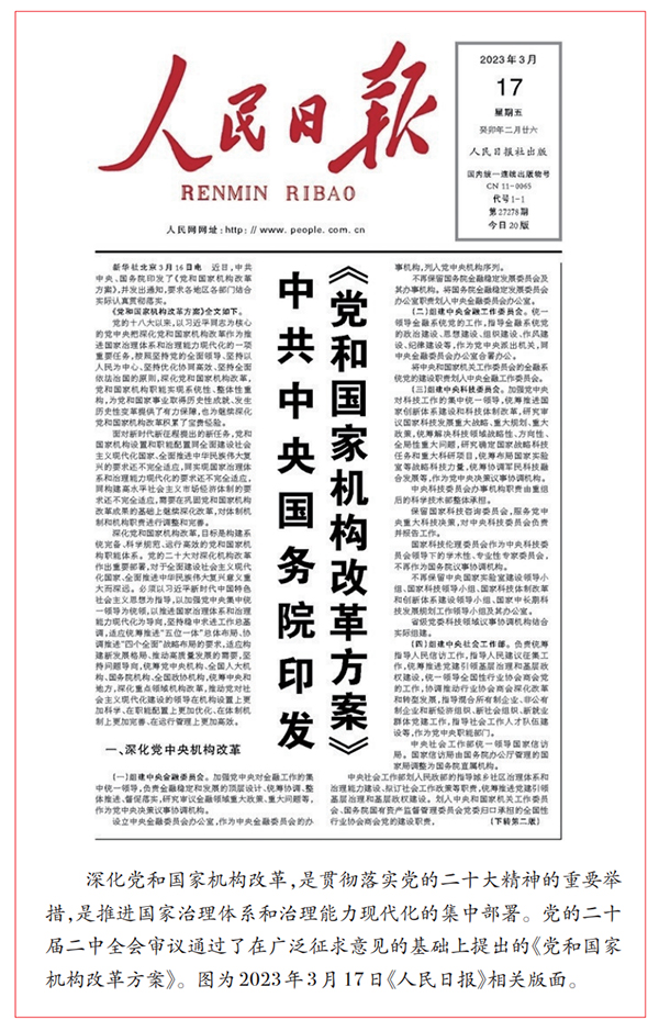 2023年2月,黨的二十屆二中全會(huì)審議通過《黨和國(guó)家機(jī)構(gòu)改革方案》,推動(dòng)黨對(duì)社會(huì)主義現(xiàn)代化建設(shè)的領(lǐng)導(dǎo)在機(jī)構(gòu)設(shè)置上更加科學(xué)、在職能配置上更加優(yōu)化、在體制機(jī)制上更加完善、在運(yùn)行管理上更加高效。