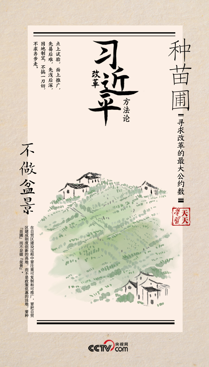 “要種‘苗圃’而不是做‘盆景’”,正是習(xí)近平對(duì)改革試點(diǎn)方法論的形象比喻和精辟總結(jié)。而正定縣農(nóng)村研究所和上海自貿(mào)試驗(yàn)區(qū),都是對(duì)這一方法論的生動(dòng)實(shí)踐。