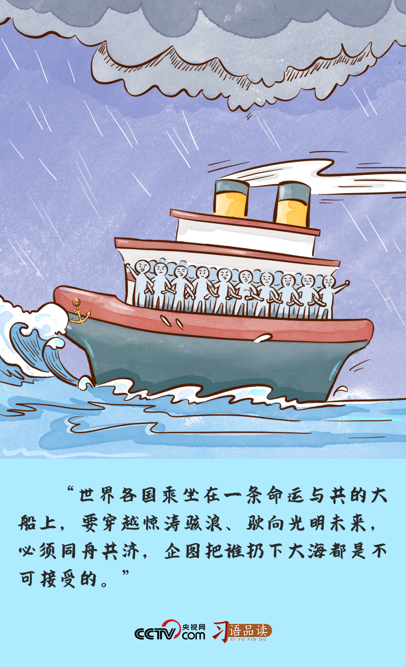 2022年1月17日,在2022年世界經濟論壇視頻會議上,習主席深刻闡釋“小船”和“大船”的關系:“各國不是乘坐在190多條小船上,而是乘坐在一條命運與共的大船上。小船經不起風浪,巨艦才能頂住驚濤駭浪。”