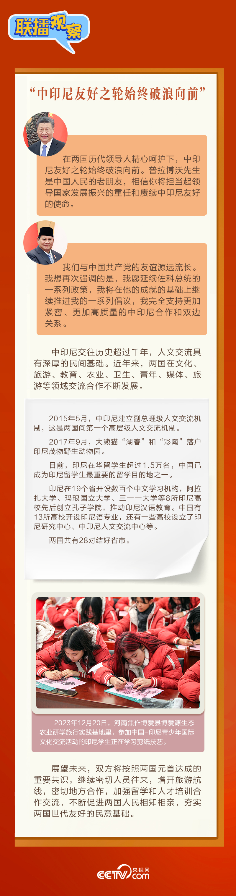 會(huì)談中,習(xí)主席以“船”為喻,稱贊“中印尼友好之輪始終破浪向前”,強(qiáng)調(diào)“愿同印尼深化全方位戰(zhàn)略合作,構(gòu)建具有地區(qū)和全球影響力的中印尼命運(yùn)共同體”。普拉博沃當(dāng)選總統(tǒng)表示“中國是印尼強(qiáng)有力的合作伙伴”,并指出“完全支持發(fā)展更加緊密的印尼同中國關(guān)系”。