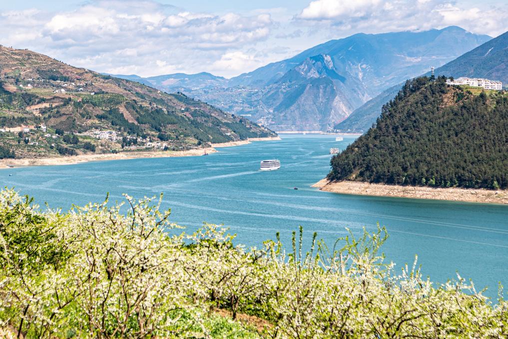 ??3月25日拍攝的重慶市巫山縣曲尺鄉(xiāng)長(zhǎng)江兩岸的萬畝李花。新華社記者 唐奕 攝