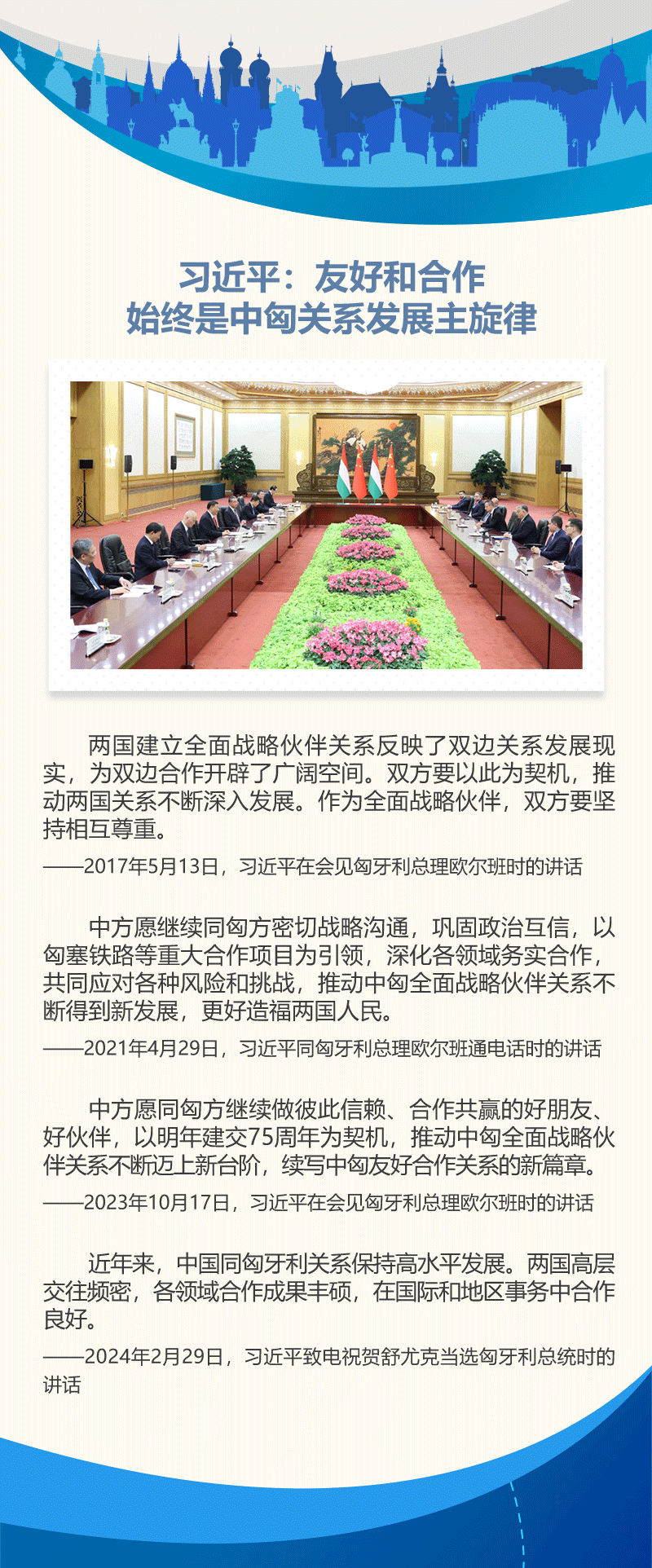 中國(guó)與匈牙利的傳統(tǒng)友誼源遠(yuǎn)流長(zhǎng)。建交75年來(lái),雙方在國(guó)際事務(wù)中相互支持、密切配合。近年來(lái),在兩國(guó)領(lǐng)導(dǎo)人的戰(zhàn)略引領(lǐng)下,中匈關(guān)系始終保持高水平發(fā)展。雙方政治互信不斷加深,互利合作成果豐碩,人文交流豐富多彩,在國(guó)際和地區(qū)事務(wù)中協(xié)作良好。