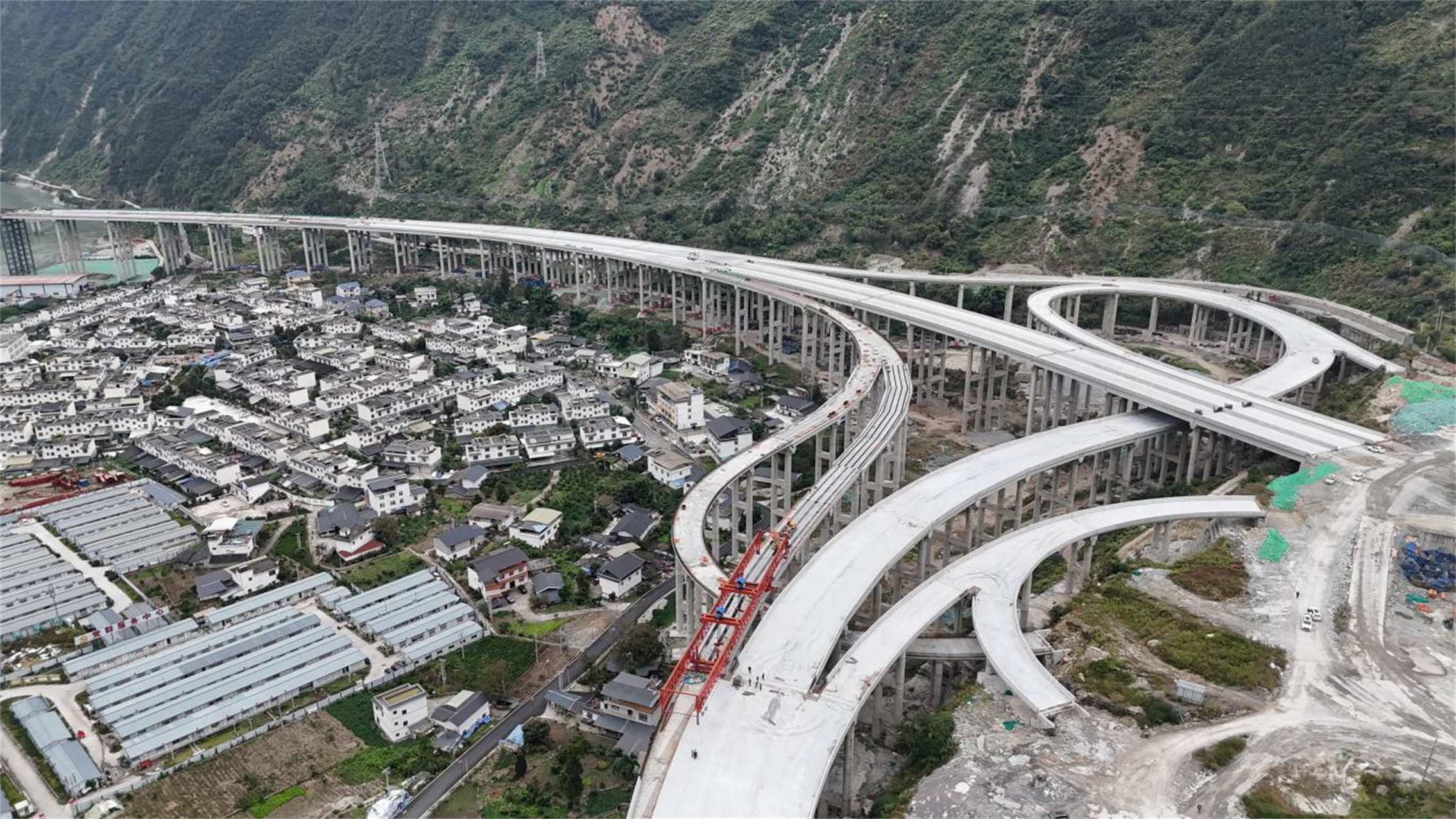 此外,海螺溝綜合體占地394畝,跨省道211施工,工程體量大,工程結(jié)構(gòu)形式復(fù)雜,上下交叉施工作業(yè)面多,加之項目靠近“9·5”瀘定地震核心區(qū)域,余震不斷,施工難度大,安全風(fēng)險高。在項目建設(shè)中,需搭設(shè)高度超40多米的滿堂支架,保障9條互通立交匝道交錯建設(shè)。面對難題,參建各方科學(xué)謀劃,對架橋機(jī)進(jìn)行改造,調(diào)整梁板架設(shè)順序,提前組織安排50多跨現(xiàn)澆箱梁的施工工序、工藝,保障了穿插在現(xiàn)澆箱梁中的預(yù)制梁板順利架設(shè)。在“9·5”瀘定地震后,項目在一個月內(nèi)完成全面復(fù)工復(fù)產(chǎn),并通過加大人員與設(shè)備投入,18聯(lián)共51跨現(xiàn)澆箱梁施工時間從2年縮短至1年,追回了施工工期,有力推進(jìn)了建設(shè)任務(wù)。