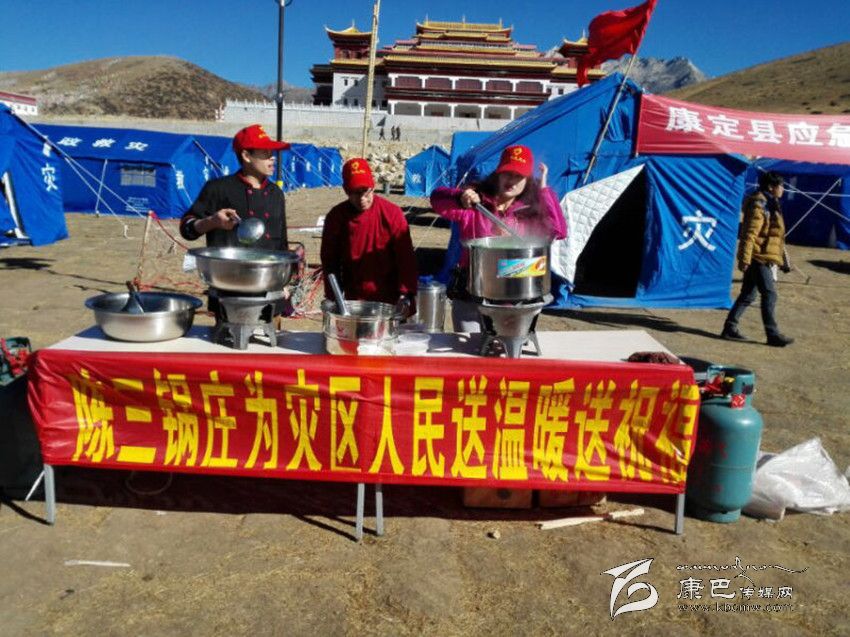 11月28日中午,記者來到康定塔公鎮(zhèn)祖慶小學采訪。在現(xiàn)場,一群戴著紅帽子的人正在將熱氣騰騰的紅燒肉一勺一勺的分發(fā)到同學們碗中。仔細一看,現(xiàn)場還有一幅標語,上面寫著“陳三鍋莊為災區(qū)人民送溫暖送祝福”的字樣。記者揉了揉眼,確定沒看錯。原來,陳三鍋莊是關了康定的門店,組織人員到災區(qū)參與抗震救災來了。