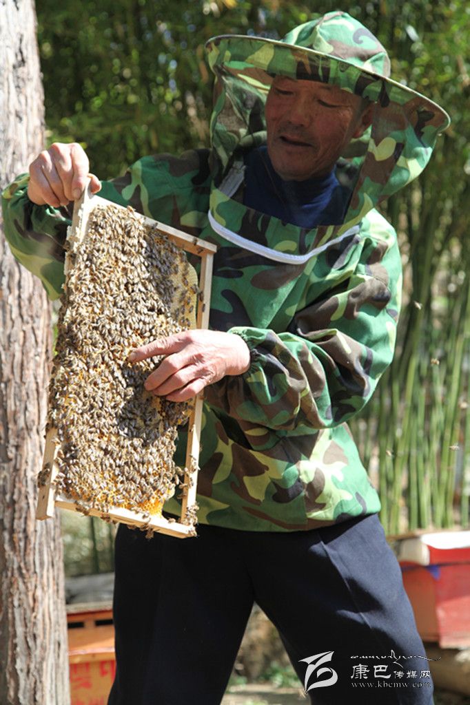 高廷明熟練地打開一只蜂箱,蜂列上密密麻麻的蜜蜂讓記者的頭皮發(fā)麻。“蜜蜂在上午和下午都有可能蟄人,那是因?yàn)槟菚r(shí)成年蜂要出去,工作蜂要‘回家’;工作蜂只能活30天,分桶時(shí)要對(duì)雄蜂數(shù)量進(jìn)行控制,這樣才能保持蜜蜂的發(fā)展速度。”站在自家的蜂場(chǎng)里,高廷明就像一位久經(jīng)沙場(chǎng)的將軍。