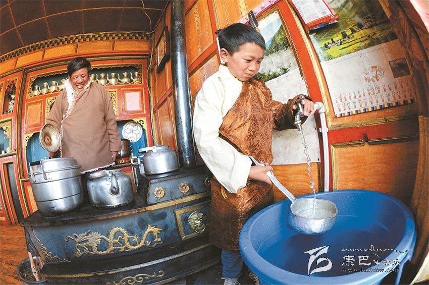 被稱為世界高城的理塘縣,“吃水難”過去一直是當(dāng)?shù)厝罕娚铍y題。2012年實(shí)施對口援建以來,樂山市和理塘縣把此項(xiàng)工作列為 “一號民生工程”來抓。2013年,樂山市和理塘縣在位于海拔5000米的理塘縣奔戈鄉(xiāng)境內(nèi)的索絨山上開建奪曲河水庫,2014年7月奪曲河水庫全部竣工,2015年10月,理塘縣首批2200戶自來水實(shí)現(xiàn)入戶,到今年底縣城中心城區(qū)將全部實(shí)現(xiàn)自來水入戶供水。圖為扎吉和家人正歡喜地接水準(zhǔn)備做飯。