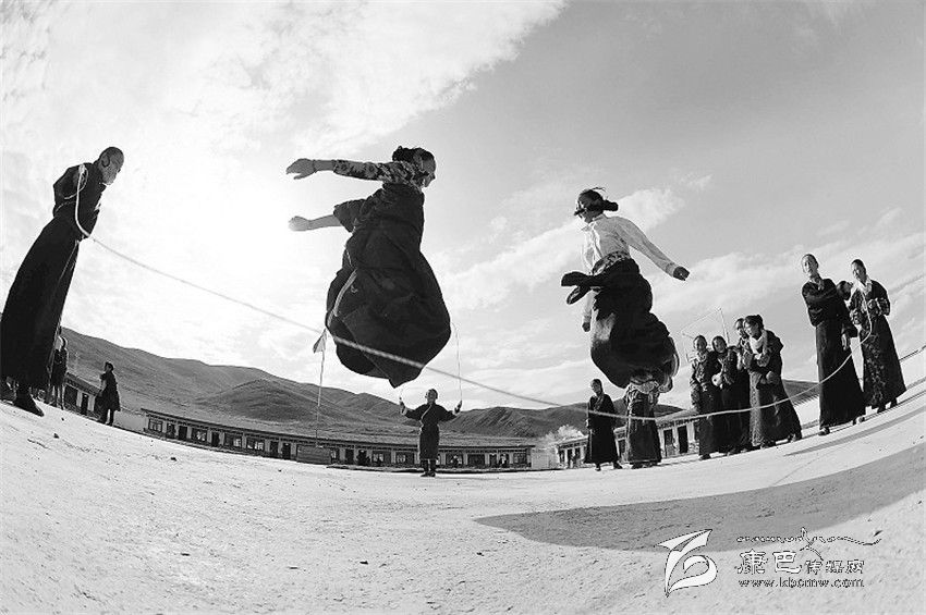 石渠縣蒙沙鄉(xiāng)奪呷村小的孩子們?cè)诓賵?chǎng)上跳繩。