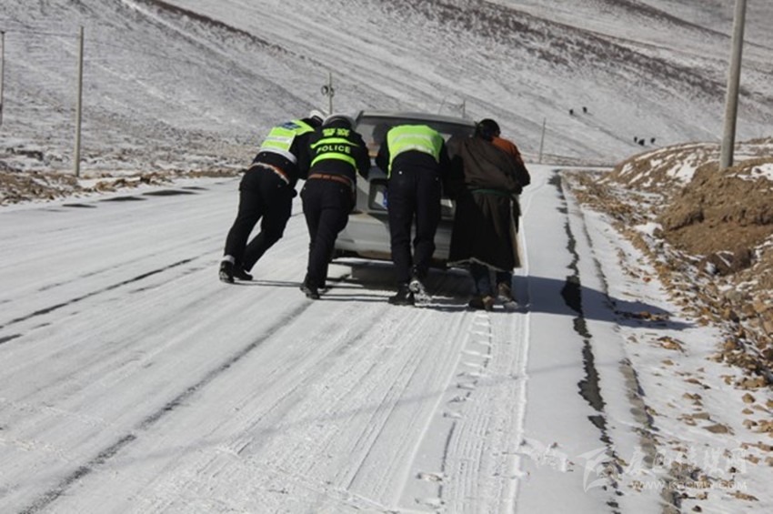 石渠縣公安局交警大隊(duì)民警大年三十巡邏時(shí)幫助群眾推車(chē) 獲群眾好評(píng)。