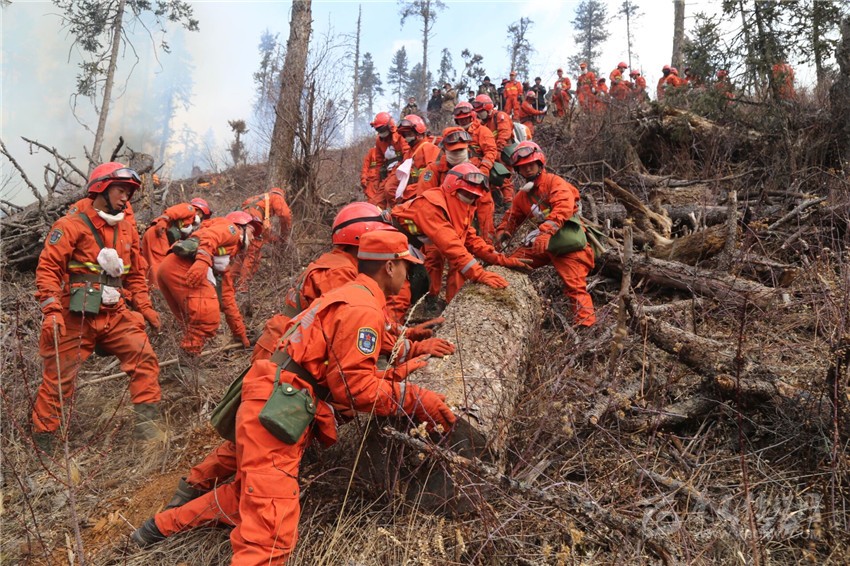 2月9日15時許,火場風(fēng)力陡然增大,火頭越過谷底向原始林區(qū)蔓延,并借助風(fēng)力迅速形成樹冠火向參戰(zhàn)官兵襲來,道孚大隊四中隊中隊長劉自立見狀立即組織官兵采取緊急避險,確保了人員、機(jī)具無一受損。隨后,滅火官兵迅速改變戰(zhàn)法,將重兵從火場西南線向西線調(diào)集,采取“一點(diǎn)突破、兩翼推進(jìn)”的戰(zhàn)術(shù),奮力撲打火頭并成功將其壓制。由于山高坡陡,站桿倒木和滾石較多,滅火指揮員不時抽調(diào)官兵清除倒木和燃著的站桿,推進(jìn)速度嚴(yán)重受限。
