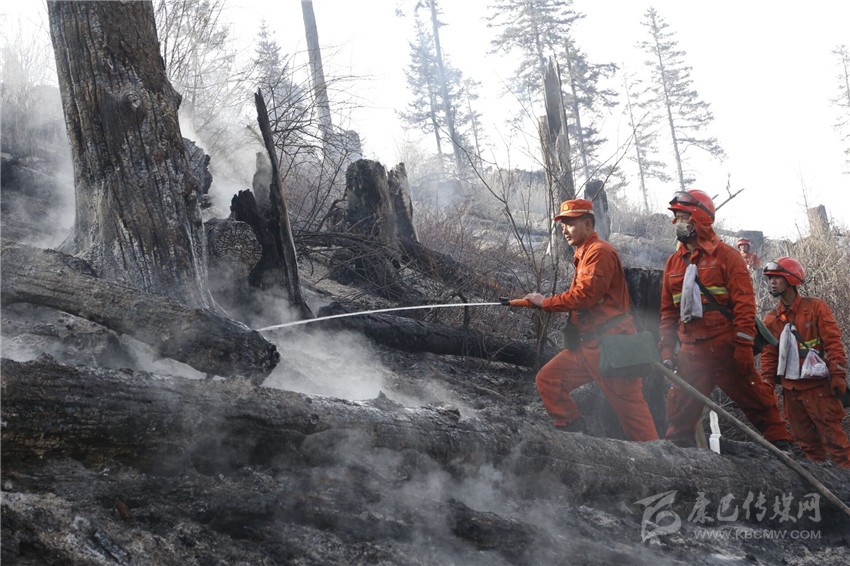 2月10日,火頭蔓延至火場東北一線,參戰(zhàn)官兵發(fā)現(xiàn)幾處被冰雪覆蓋的水源,火場前指決心改變戰(zhàn)法,采用7組水泵串聯(lián)接力向火場供水主攻明火,常規(guī)機(jī)具輔助配合消除煙點(diǎn)的方式,將部隊分為水泵和常規(guī)機(jī)具兩個梯隊,在火場火勢最為猛烈的東北側(cè)展開滅火作戰(zhàn)。參戰(zhàn)官兵用自身攜帶的鍬鎬奮力破冰面抽水,在水泵的助力下,明火得到了有效壓制并逐步熄滅。隨后,部隊和地方群眾全部轉(zhuǎn)入火場清理看守階段。