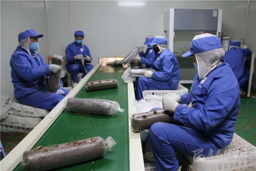 穿上防護(hù)服、經(jīng)過(guò)藥水消毒和空氣消毒后,記者進(jìn)入菌種培育室,菌棒通過(guò)傳送帶源源不斷地傳輸,工人們眼明手快地在菌棒孔里種植菌種。