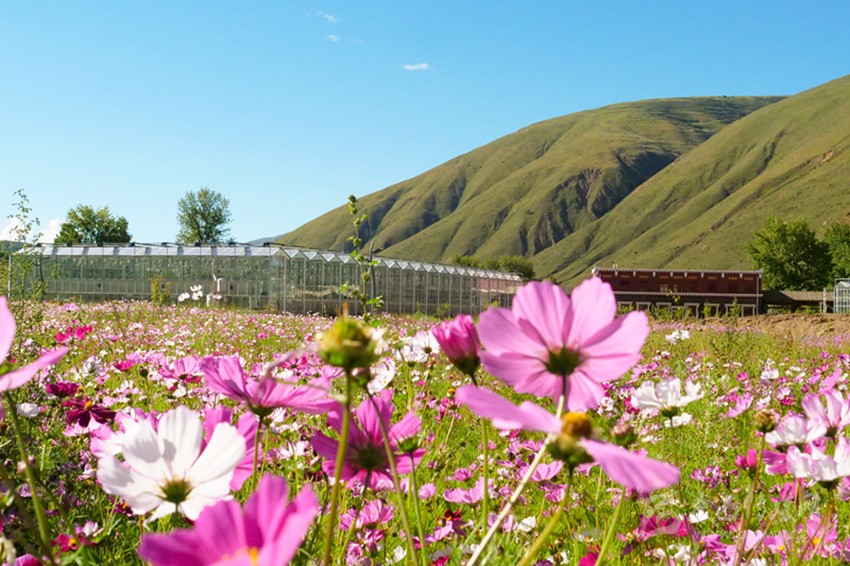 當(dāng)車輛飛馳在G305沿線,遠(yuǎn)處顏色鮮艷的圓柱形建筑十分吸引眼球,推開絳紅色的木質(zhì)大門那一刻,就像是開啟了一座寶藏之門,經(jīng)過半圓的坡道,來到了位于道孚縣鮮水鎮(zhèn)孜龍村的甘孜州康巴植物園。