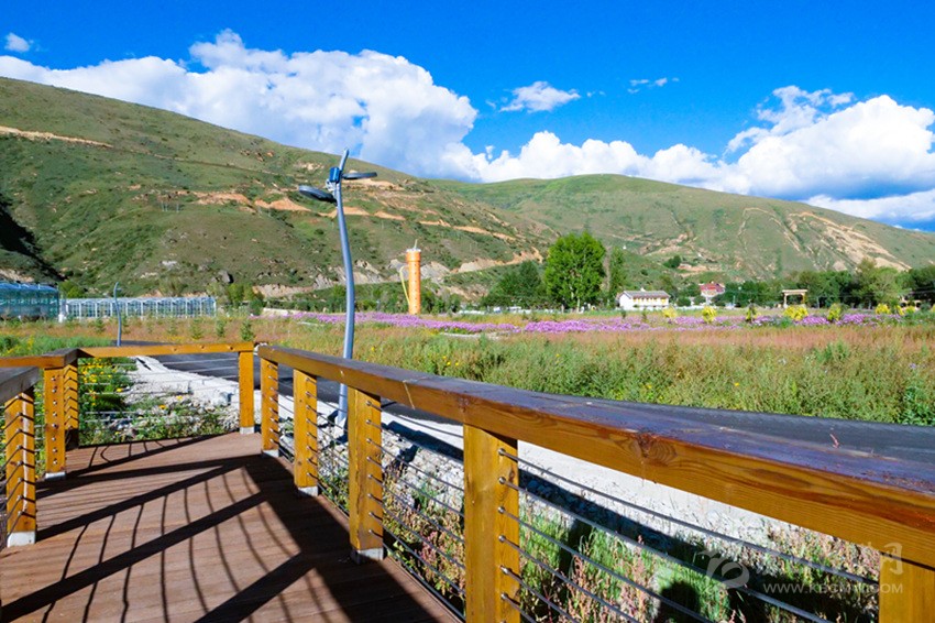 陽光下,成片開放的波斯菊搖曳生姿,成片白楊林包圍著12個(gè)16—25平方米不等的仿道孚民居外觀的樹屋,沿著鵝卵石鋪設(shè)、牡丹點(diǎn)綴的棧道漫步,兩側(cè)種植著落葉松、金葉垂榆、康定木蘭、五小葉槭等32種具有高原特色的植物,樹下種植以虞美人、百葉菊等17種花卉為主的草本植物;來到湖心島,不少人坐在其間休閑,有的坐在樹下乘涼,有的坐在溪邊聊天,還有不少人在伸臂橋上照相,不遠(yuǎn)處透明的玻璃溫室展覽館已經(jīng)完成建設(shè),走過開滿桃花的拱形門,陽光灑在地面上讓人心生暖意,廢棄的水塔變成了打酥油茶用的醬桶,山、水、溪、樹、花、屋構(gòu)成了不同意境的高原園林景觀。