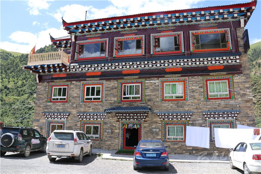 該酒店三樓一底,集餐飲、停車、住宿為一體,設(shè)單標(biāo)間和套房共計(jì)22間38個(gè)床位,雇傭了3名當(dāng)?shù)卮迕駧凸ぃ簝?nèi)甚至配套了超市和茶樓;藏文化元素俯仰皆是,雕梁畫(huà)棟,規(guī)模配備,儼已成為全縣鄉(xiāng)鎮(zhèn)一道亮麗風(fēng)景。不論淡旺季,每間房?jī)r(jià)188元至258元不等。夏季正值入住高峰期,8月以來(lái),幾乎天天客滿。