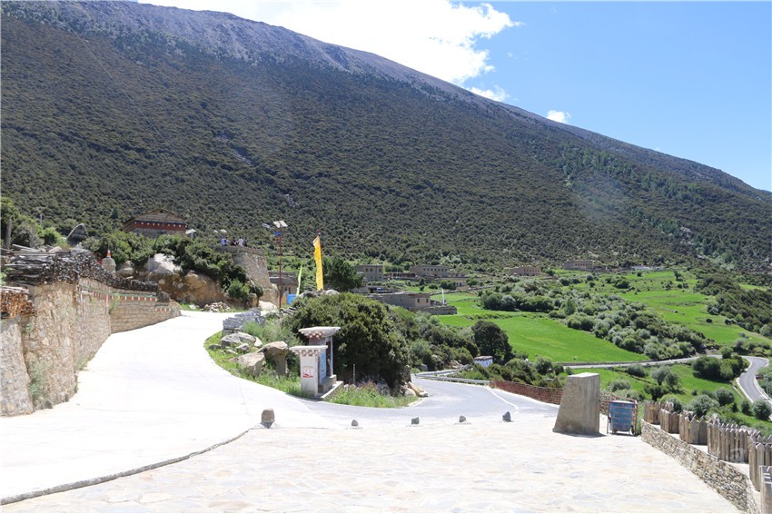從觀景平臺(tái)向村子進(jìn)發(fā),一棟棟用石塊砌成的藏房次第映入眼簾,每一棟藏房都有獨(dú)立的院落,院墻上是堆放整齊的木柴,墻邊是造型別致的花臺(tái),有的房頂上還掛著五星紅旗。走到村口,黑化通村路變成了硬化聯(lián)戶路,道路寬敞整潔,路旁有太陽能路燈、電子監(jiān)控、綠化花草和公共廁所;村中央的廣場上聚滿了人,他們有的是外來游客、有的是當(dāng)?shù)卮迕?,有的在曬著太陽閑聊,有的在對(duì)著美景拍照。在村里,記者還發(fā)現(xiàn)有幾個(gè)小賣部、不少私家車和好幾大片長勢良好的菜地,地里有一些人在勞作。