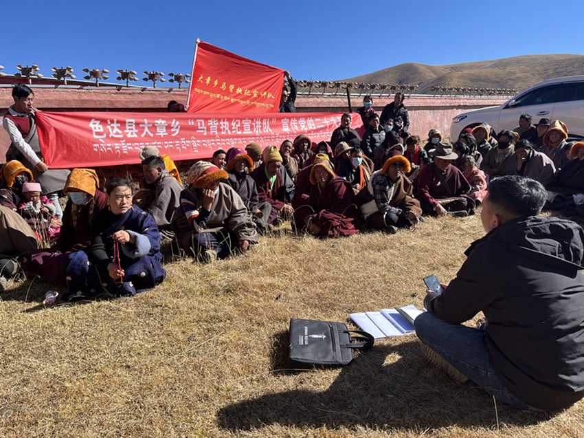“針對(duì)色達(dá)高寒偏遠(yuǎn)、地廣人稀,牧區(qū)群眾生活居住較分散的情況,我們調(diào)配縣鄉(xiāng)村三級(jí)紀(jì)檢監(jiān)察力量,逐步組建起精通藏漢雙語、熟悉紀(jì)法知識(shí)、擅長群眾工作的馬背執(zhí)紀(jì)宣講隊(duì),把黨的聲音傳遞到云端藏寨、天邊牧場?!鄙_(dá)縣紀(jì)委書記、監(jiān)委主任陳玉龍介紹,黨的二十大以來,宣講隊(duì)已開展宣講活動(dòng)20余場次,推動(dòng)為群眾辦實(shí)事10余件,解決困難訴求20件。
