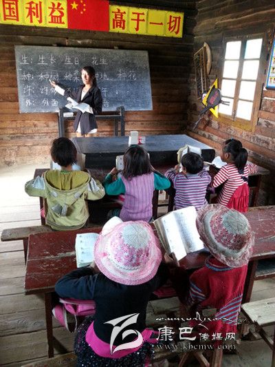 村小唯一的老師、90后藏族女孩鄧珠志瑪在黑板上寫下:生日、種樹、外面……字很大很方,“教室里沒有電燈,字寫小了怕孩子看不到。”兩排課桌,6個一年級學(xué)生坐在長板凳上,當(dāng)天有個孩子請假了,這是村小唯一的班,共7個孩子。“來,同學(xué)們和我一起念。”鄧珠志瑪朗讀起黑板上的詞語,孩子們的聲音很洪亮。