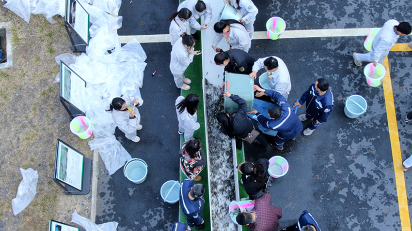 縣農(nóng)牧農(nóng)村和科技局工作人員與市民一起將長(zhǎng)絲裂腹魚、短須裂腹魚、四川裂腹魚等魚苗放入雅礱江。