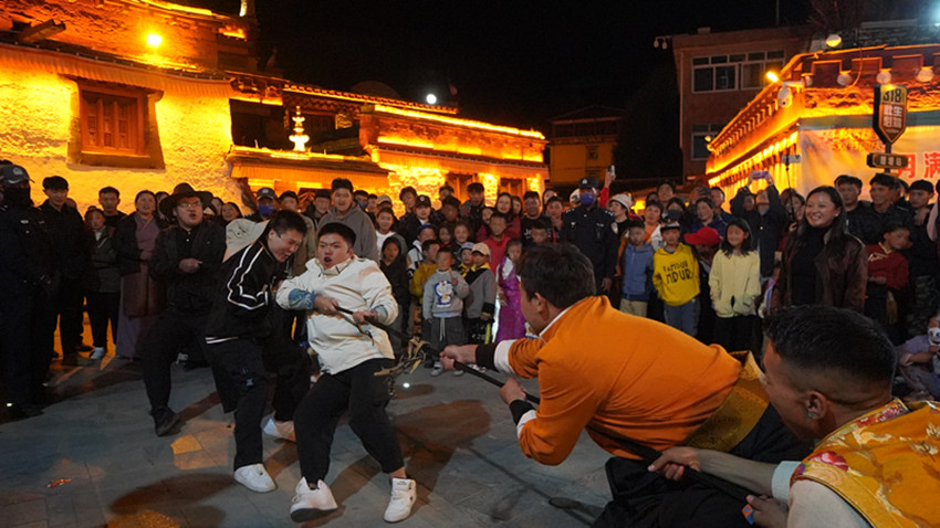 “加油、加油……”10月1日晚,在仁康小廣場(chǎng)上,遠(yuǎn)道而來(lái)的各地游客與理塘當(dāng)?shù)鼐用袢罕姸汲两诿袼谆顒?dòng)的歡樂(lè)節(jié)日氛圍中?,F(xiàn)場(chǎng)邀請(qǐng)游客進(jìn)行的三人拔河比賽,掀起了活動(dòng)高潮?!斑@里的氛圍讓我感到很舒服,也祝祖國(guó)母親生日快樂(lè)?!眮?lái)自陜西西安的游客黃家樂(lè)說(shuō)。伴隨著各族群眾手拉手跳起的鍋莊舞,游客和群眾深切感受到民族大團(tuán)結(jié)的溫暖。