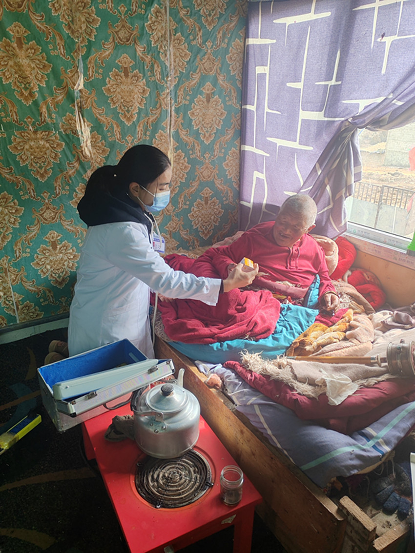 白玉縣麻邛鄉(xiāng)衛(wèi)生院醫(yī)生沈富瓊深入村民呷拖家開展巡診工作。