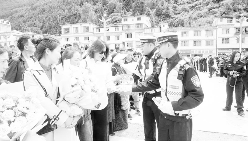 圖為交警向候考的家長(zhǎng)發(fā)放礦泉水。