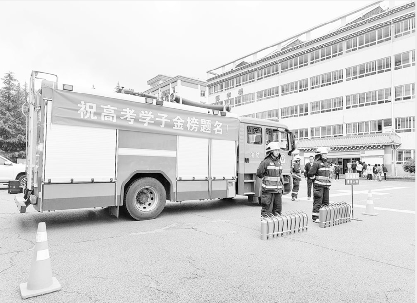 圖為消防隊(duì)員為高考保駕護(hù)航。