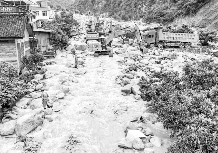8月4日,在康定市姑咱鎮(zhèn)日地村,救援人員操作機械疏通國道318線。 新華社記者 劉坤 攝