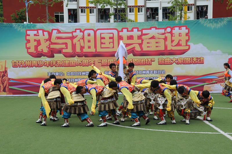 活動(dòng)中,同學(xué)們先后演唱了《黃河頌》、《我愛您,中國!》、《夢圓中國》等多首紅色經(jīng)典歌曲。你方唱罷我登場,現(xiàn)場氣氛熱烈,高潮迭起。優(yōu)美的歌聲唱出了我青少年的愛國情懷,一面面飄揚(yáng)的紅旗表達(dá)著對祖國的深情祝福。來自州職業(yè)技術(shù)學(xué)校、四川民族學(xué)院、省藏校、甘孜衛(wèi)校、州青聯(lián)委員以及我州著名歌手共1000多人放聲高歌,共同慶祝新中國成立65周年華誕。
