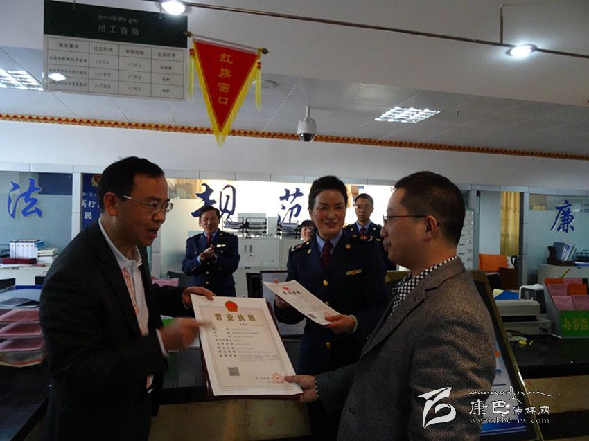 本網(wǎng)訊(郭梅/文 鄧安宇/圖 ) “我在綿陽市做生意,甘孜州提出打造‘圣潔甘孜’品牌時,我就醞釀注冊一家電商公司,在新聞上看到甘孜州要實行‘先照后證’,我第一時間趕過來,不到15分鐘就拿到了營業(yè)執(zhí)照!”10月8日上午,我州“先照后證”試點工作在康定縣啟動后,州政府政務(wù)大廳工商窗口把“先照后證”第一份營業(yè)執(zhí)照頒發(fā)給了敬開春,登記窗口書面告知他,隨后將在康定縣食藥局辦理食品流通許可證。