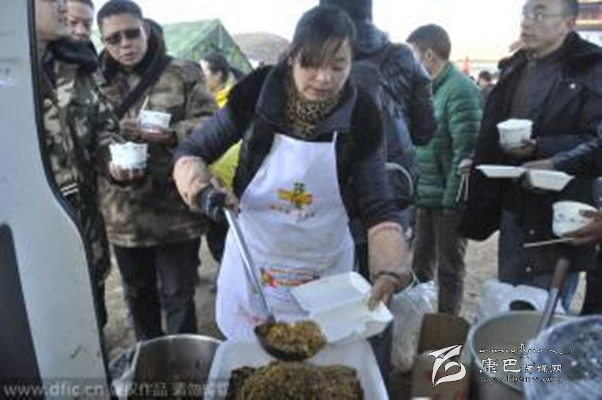 據(jù)了解,韓大哥是這家飯店的老板之一,他是仁壽縣人,幾年前和朋友來到新都橋開始經(jīng)營(yíng)飯店。康定6.3級(jí)地震發(fā)生時(shí),他人在成都。但看到災(zāi)情發(fā)生,韓大哥立即和飯店另外幾個(gè)合伙人決定到安置點(diǎn)免費(fèi)送盒飯,“我在當(dāng)?shù)刈隽?、7年生意,現(xiàn)在出了事情,就應(yīng)該伸手支援嘛!”據(jù)韓大哥介紹,此次地震發(fā)生后,新都橋80%左右的飯店都已經(jīng)關(guān)門,他們的飯店因?yàn)檫€有一些接待工作,仍在正常營(yíng)業(yè)。自11月23日晚上,他家的飯店就主動(dòng)為塔公鎮(zhèn)的安置點(diǎn)免費(fèi)派送盒飯,“包括中午和晚上兩頓,兩葷兩素一湯的配置。”因?yàn)樘Γ №n大哥來不及仔細(xì)統(tǒng)計(jì),他大概知道每天送出的盒飯?jiān)?200盒到1500盒之間,每天送出盒飯的成本在4、5千左右。但在他看來,這些其實(shí)都算不上什么,“能為災(zāi)區(qū)出一份力,我們就很滿足了,我們打算一直送到抗震救災(zāi)工作結(jié)束,也就是直到災(zāi)民有條件自己做飯的時(shí)候。”“這邊天氣很冷,他們吃的一般是些面包、牛奶之類的干糧,我們就是想讓大家吃到熱飯、熱菜。”據(jù)韓大哥介紹,每天飯店都會(huì)派出3、4個(gè)人將盒飯運(yùn)送到安置點(diǎn),“只要有人需要我們都會(huì)分發(fā)盒飯,包括一些志愿者和武警官兵也吃我們的飯。