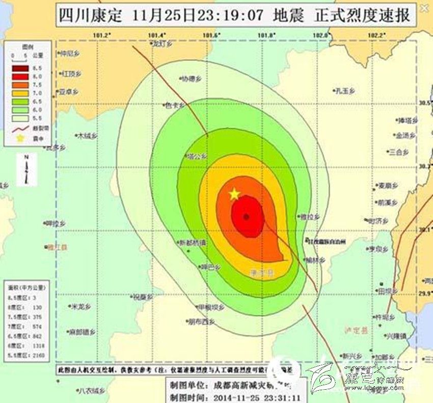 據(jù)人民網(wǎng)成都11月26日?qǐng)?bào)道  記者剛剛從成都高新減災(zāi)研究所了解到,11月25日23時(shí)19分在四川省甘孜藏族自治州康定縣(北緯30.2度,東經(jīng)101.7度)發(fā)生5.8級(jí)地震,此次地震系康定6.3級(jí)地震的余震。