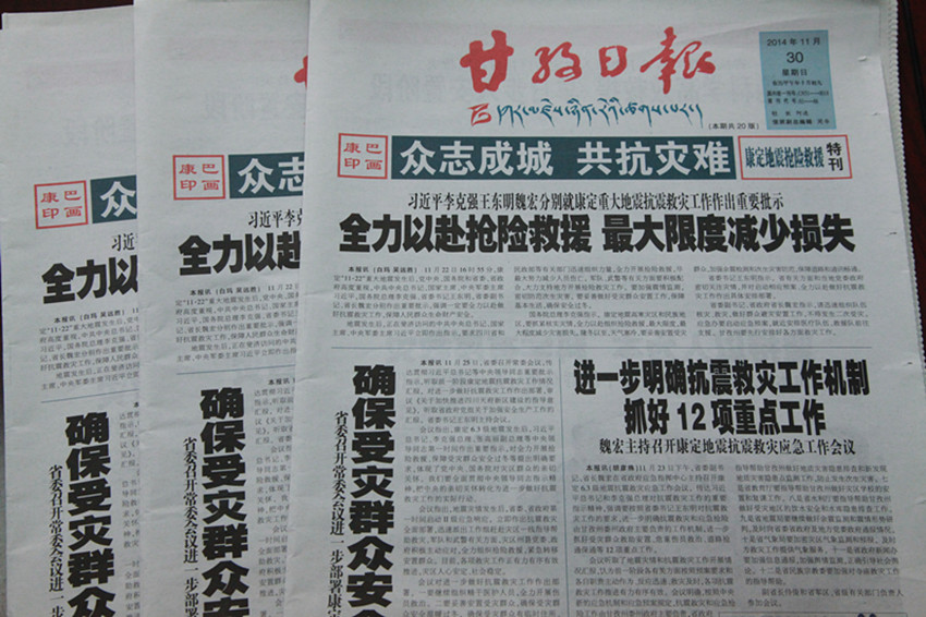又訊 此外,自康定地震發(fā)生以來,本報藏漢文報廣大編采人員發(fā)揚連續(xù)作戰(zhàn)的精神,已經(jīng)連續(xù)9天不分白天黑夜地工作,保證了一線有記者的身影,后方編輯及時發(fā)聲,截止30日,本報藏漢文報已經(jīng)出版13期《眾志成城 共抗災(zāi)難》??鸵黄谔乜?,共計72個版面;本報《康巴傳媒網(wǎng)》自開辦網(wǎng)站以來,首次實現(xiàn)了網(wǎng)站信息即時更新、滾動發(fā)布,網(wǎng)站日上稿量超過100條,日點擊量均超過10萬人次;本報微信平臺則采用短平快的方式,第一時間發(fā)布最新資訊,引導(dǎo)公眾情緒,傳播黨委政府的聲音,微信日點擊和轉(zhuǎn)發(fā)量超過2萬人次;除此之外,本報承辦的手機報也發(fā)揮了巨大的作用。