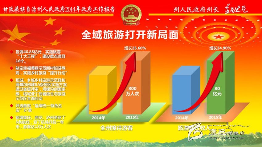 全域旅游打開新局面。投資40.83億元,實(shí)施旅游“十大工程”,建設(shè)重點(diǎn)項(xiàng)目16個(gè)。制定幸福美麗示范新村旅游導(dǎo)則,實(shí)施鄉(xiāng)村旅游“提升行動(dòng)”;稻城、鄉(xiāng)城鄉(xiāng)村旅游示范縣和海螺溝創(chuàng)建5A級(jí)景區(qū)實(shí)施方案通過省級(jí)評(píng)審,海螺溝創(chuàng)國家級(jí)、稻城亞丁創(chuàng)省級(jí)生態(tài)旅游示范區(qū)全面啟動(dòng);評(píng)選首批“最康巴——特色名店”57家。新增重慶、西安、瀘州至亞丁3條航線,亞丁機(jī)場(chǎng)開航一年來,游客達(dá)18萬人次。全州接待游客800萬人次,實(shí)現(xiàn)旅游綜合收入80億元,分別增長(zhǎng)25.6%和24.9%。全域旅游更加深入人心,旅游業(yè)正成為我州經(jīng)濟(jì)發(fā)展的“助推器”、群眾增收的“搖錢樹”。