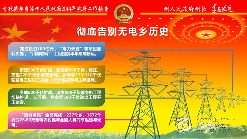 大力推進(jìn)電力通信建設(shè)。投入20億元,加快實(shí)施“電力天路”、無電地區(qū)電力建設(shè)新增項(xiàng)目和農(nóng)網(wǎng)改造升級(jí)工程,切實(shí)緩解邊遠(yuǎn)地區(qū)群眾缺電問題;完成長(zhǎng)河壩電站500千伏等3個(gè)輸變電項(xiàng)目;統(tǒng)籌抓好表后入戶工程,確保群眾安全用電。投入6億元,新建通信光纜2360公里、基站1025個(gè),解決國省干道、旅游景區(qū)景點(diǎn)信號(hào)盲區(qū);新增30個(gè)自然村通電話、545個(gè)行政村通寬帶,出口總帶寬達(dá)到82G。