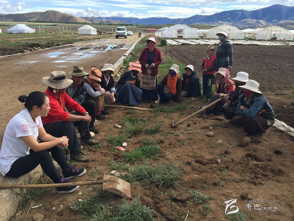 鄉(xiāng)黨委書記使朗擁忠(左一)了解村民在圣地農(nóng)莊打工及學習蔬菜種植情況︒ 葉強平 攝