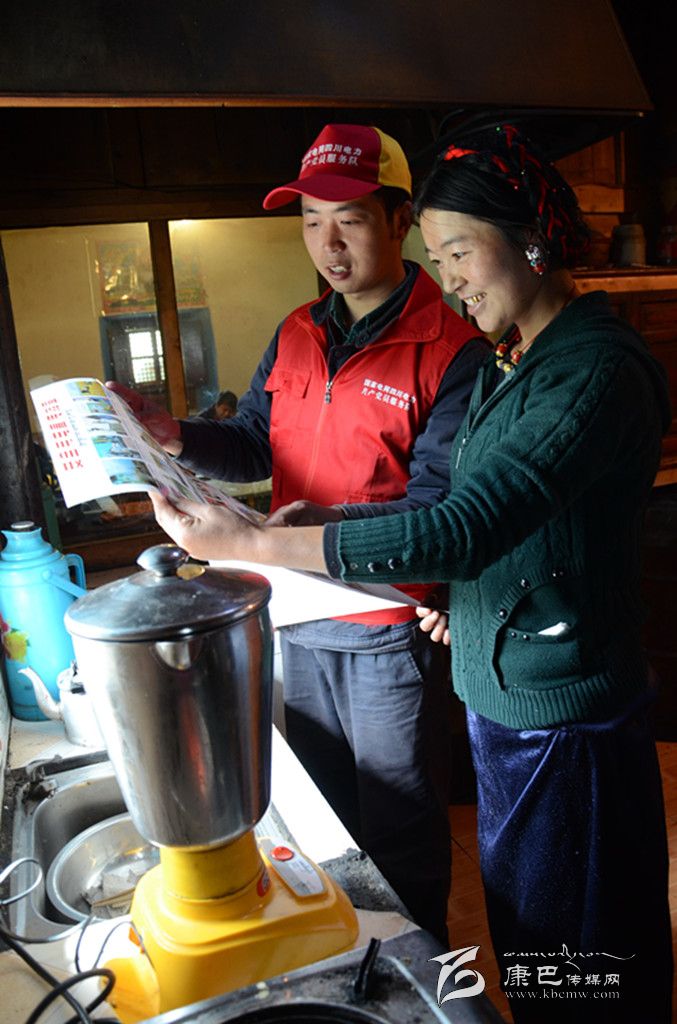 告別學校的同學們,新都橋供電所的工作人員又趕向下一個地點——瓦澤鄉(xiāng)營官村。走進一戶農民的家里,女主人汪修卓瑪正在用打茶機制作酥油茶,打茶機旁的電爐上一個水壺正在咕嚕咕嚕地冒著熱氣。工作人員趕緊走上去關掉電爐,并告訴汪修卓瑪:“你們平時使用電爐等家用電器要注意安全,水特別容易導電,水開了要及時關掉電爐,使用打茶機時要先擦干外殼和底部的水……”