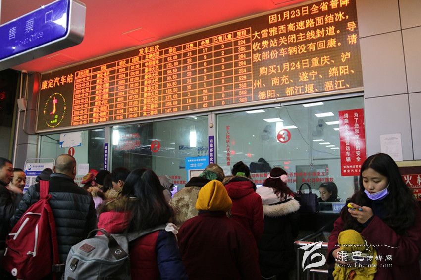 原來,汽車站售票窗口上方的視頻上滾動播放著:“因1月23日全省普降大雪,雅西高速路面結(jié)冰,收費站關(guān)閉主線封道,導致部分車輛沒有回康定。請購買1月24日到重慶、瀘州、南充、遂寧、綿陽、德陽、都江堰、溫江、雙流(1402次)、仁壽、眉山、西昌、宜賓、安岳、廣安的旅客到售票窗口退換車票。”