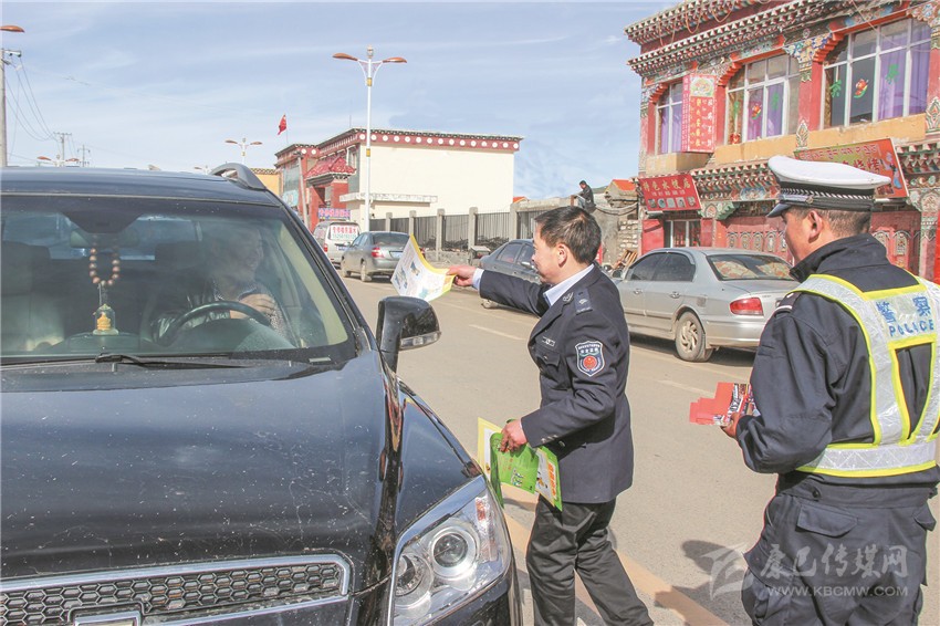 發(fā)放道路交通安全手冊。石渠縣委宣傳部供稿