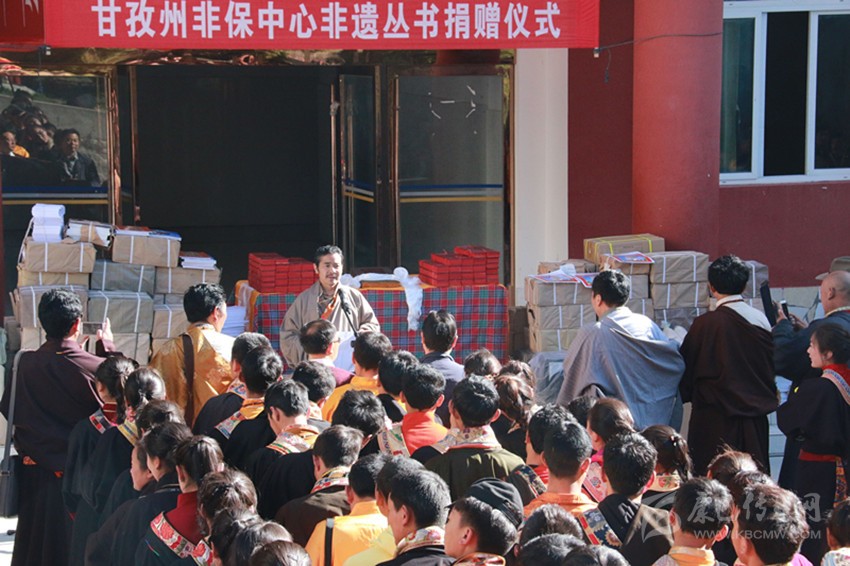 (本網(wǎng)記者 益西貢布 攝影報(bào)道)5月13日,州文化館非遺保護(hù)中心非遺叢書捐贈(zèng)儀式在四川省藏文學(xué)校舉行。此次捐贈(zèng)的700多冊(cè)非遺書籍和畫冊(cè)是十多年來州文化館非遺保護(hù)中心通過各種渠道收集、整理、出版的非遺叢書。圖為捐贈(zèng)儀式現(xiàn)場。