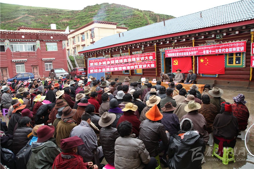上午10時(shí)30分,宣講在濛濛細(xì)雨中開始了。只見村民們?nèi)纪χ毖鼦U端坐在雨中,一雙雙渴望的眼睛聚焦在宣講臺(tái)上;宣講員松吉尼瑪用生動(dòng)的例子、經(jīng)典的藏族諺語(yǔ)講述了黨的政策和省第十一次黨代會(huì)精神,生動(dòng)感人的宣講讓現(xiàn)場(chǎng)400余名村民、寺廟僧尼和各級(jí)干部滿意的笑聲瞬間蓋過(guò)了打著持久戰(zhàn)的雨聲。