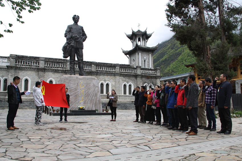 本網(wǎng)訊 (本網(wǎng)記者 秦松 攝影報道)日前,甘孜日報社全體黨員與群眾工作全覆蓋結對共建共創(chuàng)的海螺溝燕子溝鎮(zhèn)的躍進坪村支部、南門關村支部、麻柳林村支部、喇嘛溝村支部的黨員,懷著崇敬的心情來到磨西長征紀念館毛主席塑像前,舉行緬懷革命先烈、重溫入黨誓詞活動。活動中,黨員們還與共建共創(chuàng)支部黨員進行了座談。圖為宣誓活動現(xiàn)場。
