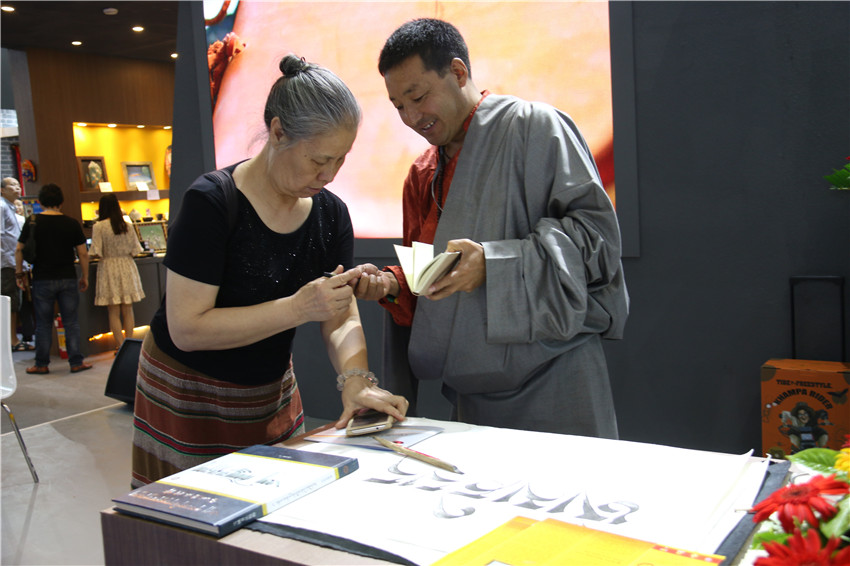 而在同一地點的另一側(cè),省級藏文書法傳承人巴松鄧珠的藏文書法也吸引著眾多愛好書法市民前來觀賞,還有的與他合影?!爸笇?dǎo)過我的書法家非常多,他們不僅給了我許多寶貴的意見,更重要的是給了我信心和動力,讓我堅持寫書法,并成為康體藏文書法的傳承人?!卑退舌囍檎f,這次能夠得到州委、州政府搭建的平臺,我會珍惜好這次難得的機(jī)遇,把作品展示好、宣傳好,讓全國各地的人們更多地了解我州民族文化。