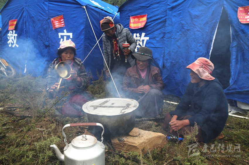 曲珍、曲西和幾個(gè)伙伴正在燒著開水。“這是到安置點(diǎn)后我第一次生火。前兩天吃干糧喝礦泉水,讓喝慣了酥油茶的我們很不適應(yīng)。”曲珍說。