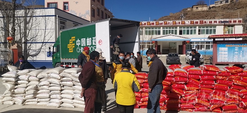 圖為抗疫期間,甘孜郵政為鄉(xiāng)鎮(zhèn)百姓配送蔬菜、大米等生活物資。