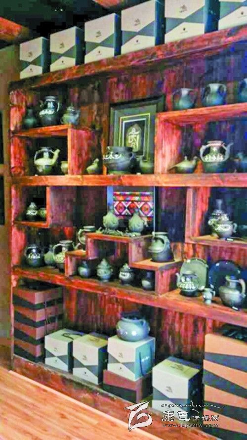 專賣店位于康定情歌廣場右側(cè)。店面古樸簡潔,店鋪內(nèi),沒有華麗的裝飾,沒有鮮亮的色彩,一件件或黑色、或土黃色的土陶產(chǎn)品靜靜地?cái)[放在木質(zhì)陳列架上。產(chǎn)品有傳統(tǒng)的器形,如雙耳罐、香爐、茶壺等,又有新研發(fā)出的器形,如茶具、餐具、筆架等等。產(chǎn)品在將傳統(tǒng)工藝與現(xiàn)代工藝巧妙結(jié)合的基礎(chǔ)上,還融入了藏族傳統(tǒng)文化,民俗文化、宗教文化、吉祥文化等元素,以其拙樸典雅的造型向人們訴說著“阿西土陶”悠久的文化內(nèi)涵與歷史淵源。