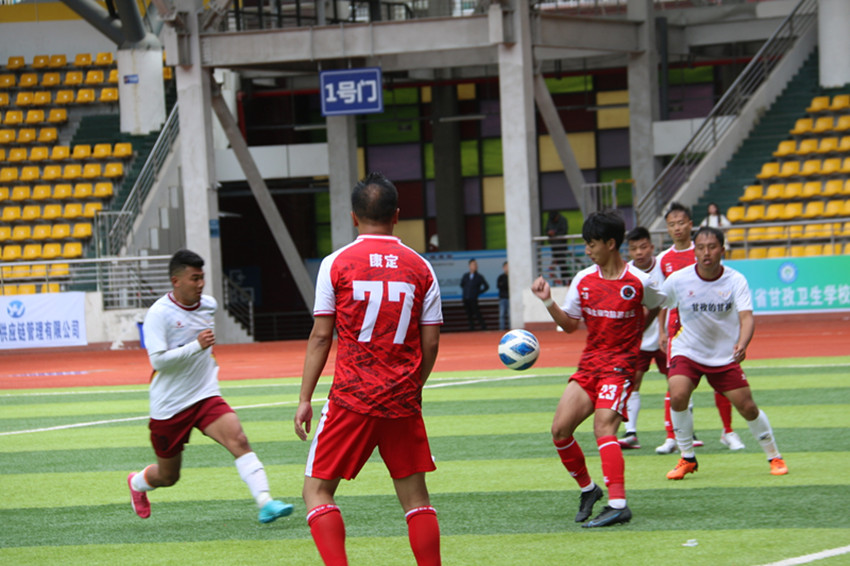 在下午的總決賽中,球場的氣氛被推向了最高潮,雖然小雨淅瀝,但球員和球迷的氣氛依舊不減,康定隊(duì)和甘孜隊(duì)都極力渴望突破重圍奪得桂冠,登上冠軍寶座。在上半場比賽中,雙方球員頑強(qiáng)拼搏,積極進(jìn)攻,嚴(yán)密防守,為本屆運(yùn)動會足球賽的最后一場比賽全力以赴。在屢次界外球與定位球之后,裁判哨聲響起,上半場比賽結(jié)束,比分仍然定格在0:0。