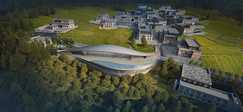 “這個香巴拉文化博物館模擬了‘吉祥八寶’之一的白海螺形態(tài),朝村莊一側(cè)是從地面延伸而成的體量,共分3層,總高度17.4米,總建筑面積2994.6平方米?!敝薪ò司治髂辖ㄔO(shè)工程有限公司項目總工喬興國向記者介紹,香巴拉文化博物館朝村莊一側(cè)是從地面延伸而成的體量,自然地融于山林中,朝山谷一側(cè)通過水面反射回應(yīng)壯麗雪山。