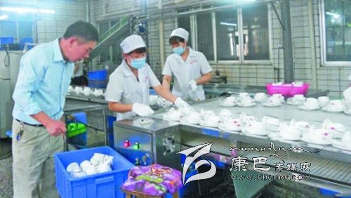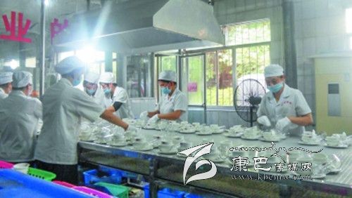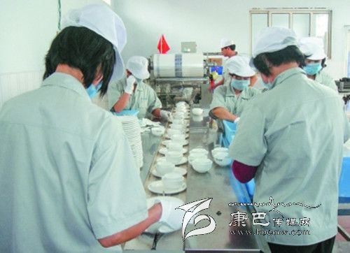 6、包裝。經過消毒后的餐具被送到約2米長的綠色傳送帶上,工人先用手把餐具按照包裝要求擺放好。之后送到包裝機器,用包裝膜封口包裝。