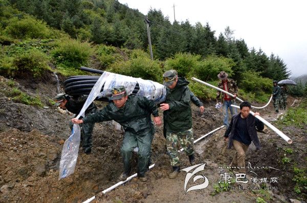 “非常感謝武警官兵!如果不是你們幫忙,我們的‘引水到村’計劃將一再推遲,影響村民的用水……”老榆林村村長項康玉感激地對官兵說。老榆林村原來的自來水飲用水源現(xiàn)已不夠用了,村民吃水面臨時斷時有的問題,為保證村民飲用水供應(yīng),由政府出資一部分,村民集資一部分,村里決定利用山頂常年的冰雪融水作為水源。前期,老榆林村已請工程隊挖好山頂至村子的2000余米的管線溝,由于連日陰雨,加之山高路險,鋪設(shè)管線工程的事一拖再拖,以致挖好的管線溝多處被雨水沖下的泥石填埋,嚴重影響飲水工程的竣工時間。村民們心里都很著急,但村里的年輕人大部分都外出打工,留守的大多是婦幼,抽不出勞力,村長項康玉無奈之下求助武警官兵。武警四川省總隊二支隊領(lǐng)導得知情況后,第一時間派出官兵投入老榆林村自來水管線鋪設(shè)工程。