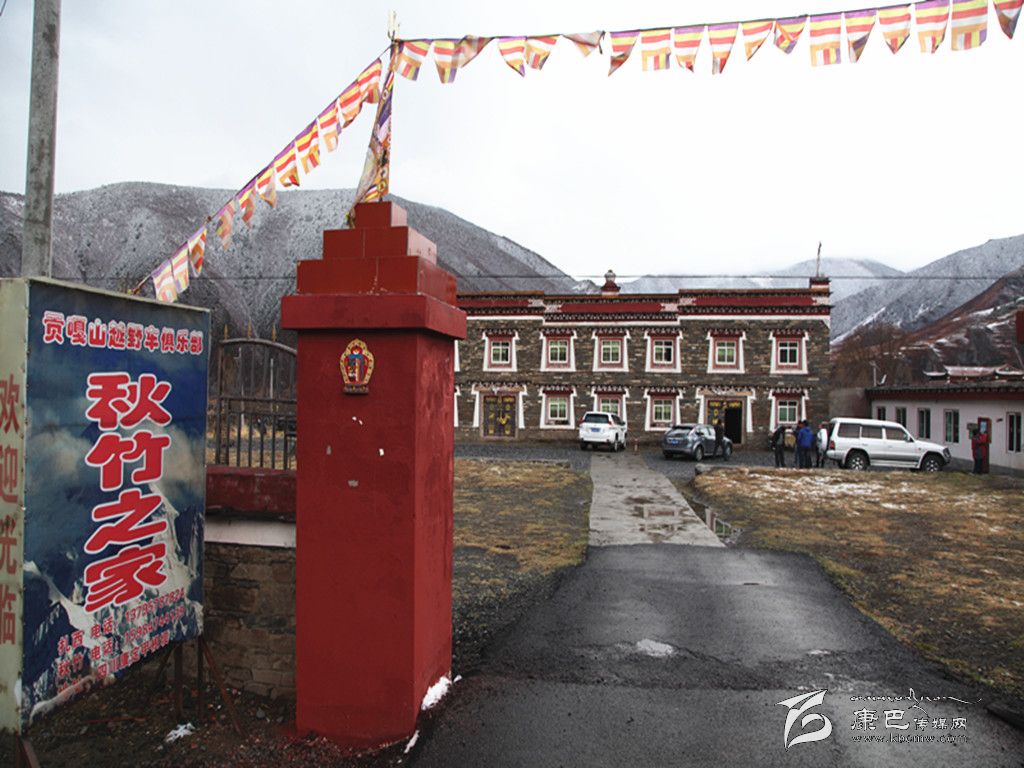 在距鄉(xiāng)政府不遠(yuǎn)的營(yíng)九路邊上,有一個(gè)“貢嘎山越野車俱樂(lè)部·秋竹之家”的燈箱廣告。在雪山的映襯下,這個(gè)不大的燈箱廣告顯得格外引人注目。步入“秋竹之家”的大門,進(jìn)入眼簾的是一幢民族風(fēng)格濃郁的建筑,黑白紅三色相間的墻面,還沒(méi)有吐綠的院壩,所有的一切,都讓記者看不出這幢建筑與普通民居有什么不同的地方。